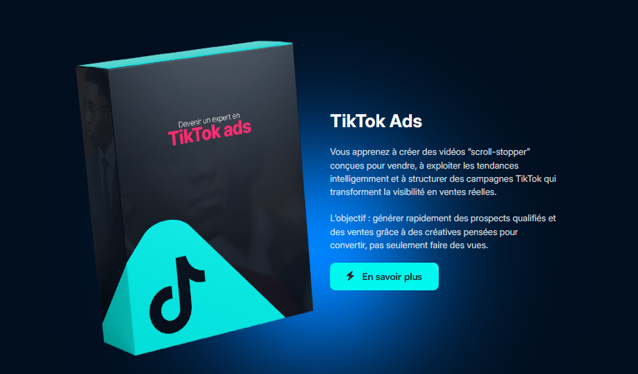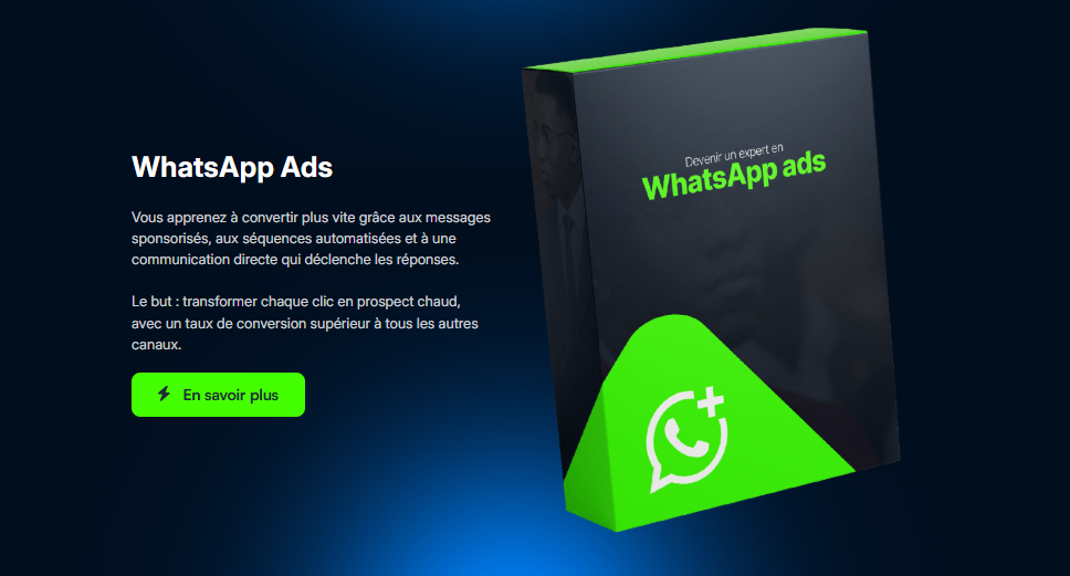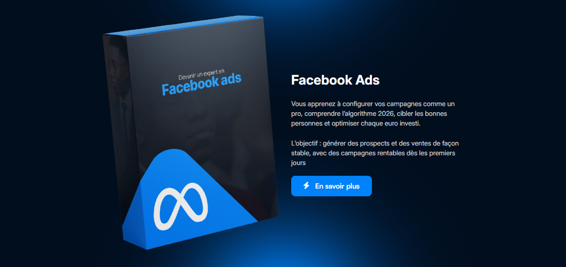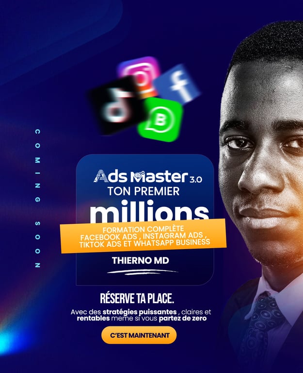 Tu dépenses de l'argent en pub mais les clients ne suivent pas ? Ads Master 3.0 est fait pour toi. Ads Master 3.0 est le programme complet qui t'apprend à construire un système digital rentable grâce à Facebook, Instagram, TikTok et WhatsApp Business. Pas de la théorie. Pas des vidéos techniques interminables. Un système concret, étape par étape, pour passer de "je teste au hasard" à "je génère des clients réguliers". Ce que tu vas apprendre : ✅ Mindset & Positionnement — Comprendre pourquoi tes pubs échouent et comment repositionner ton offre pour attirer les bons clients ✅ Créer une offre irrésistible — Structurer ton produit ou service pour qu'il se vende presque tout seul ✅ Copywriting qui convertit — Écrire des accroches, des scripts vidéo et des messages WhatsApp qui déclenchent l'achat ✅ Contenu organique — Attirer des prospects sans payer, et créer de l'autorité sur les réseaux sociaux ✅ Publicité payante — Lancer, tester et optimiser tes Facebook Ads, Instagram Ads et TikTok Ads avec un budget maîtrisé ✅ WhatsApp Business & Closing — Transformer chaque lead en client sans forcer la vente Pour qui ? Entrepreneurs, coachs, formateurs, commerçants et PME qui veulent vendre plus en ligne — même sans aucune expérience en publicité digitale. Le résultat ? Tu sais exactement quoi poster, quand poster, et comment convertir. Tu ne gaspilles plus ton budget. Tu as un système fiable qui travaille pour toi.